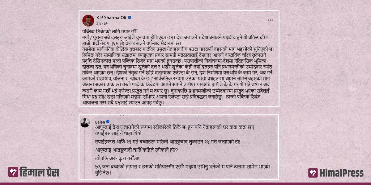 त्यसपछि ‘७६ जना बच्चाको हत्यारा र उसको मतियारसँग एउटै मञ्चमा उभिनु भनेको म पनि त्यसमा सामेल भएको बुझिने छ’ समेत बालेनले भनेका छन्। भदौ २३ को जेनजी आन्दोलनलाई लिएर नेताहरूबीच छेडखानी भइरहेको छ। ओलीले सिंहदरबारसहितका संरचना जलाउनमा बालेनको हात रहेको आरोप लगाउँदै आएका छन् भने बालेनले भदौ २३ मा गोली हानिएका बालक ओलीले नैतिक जिम्मेवारी लिनुपर्ने बताएका छन्। ओली र बालेन आगामी फागुन २१ मा हुने निर्वाचनमा एकै क्षेत्र अर्थात झापा ५ मा भिड्दैछन्। यही कारण सोही क्षेत्रको चर्चा बढेको छ।