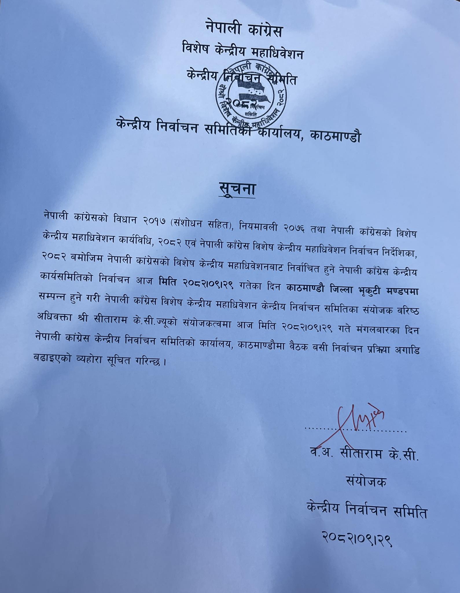 काठमाडौँ- नेपाली कांग्रेसको विशेष महाधिवेशन नयाँ नेतृत्व चयनको प्रक्रियामा अघि बढेको छ। संस्थापन पक्षसँग भएको वार्ता सकारात्मक नभएपछि निर्वाचन कार्यतालिका सार्वजनिक गरिएको हो। महाधिवेशन काठमाडौँ भृकुटीमण्डपमा जारी छ।
