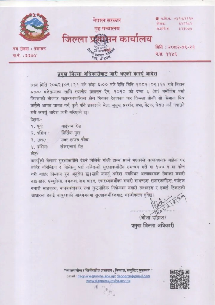 प्रमुख जिल्ला अधिकारी भोला दाहालले वीरगञ्ज महानगरपालिका क्षेत्रका निश्चित क्षेत्रभित्र कर्फ्यु लगाइएको जानकारी दिएका छन्। उनका अनुसार पूर्व बाईपास रोड, पश्चिम सिर्सिया पुल, उत्तर पावर हाउस चोक र दक्षिण शंकराचार्य गेट क्षेत्रमा कर्फ्यु आदेश जारी भएको हो।