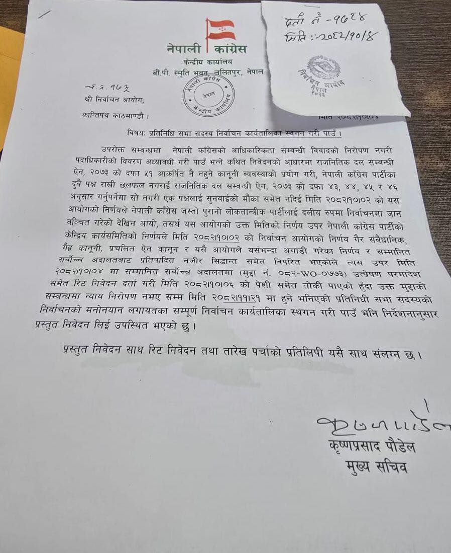 पार्टी कार्यालयका मुख्यसचिव कृष्णप्रसाद पौडेल र पूर्वमहान्यायाधिवक्ता खम्बाबहादुर खाती र अधिवक्ता केशवराज जोशीले निर्वाचन आयोग पुगेर निर्वाचन कार्यक्रम स्थगनको निवेदन दर्ता गराएका छन्। ‘निर्वाचन आयोगको गत शुक्रबारको निर्णयले मुलुकको लोकतान्त्रिक र पुरानो पार्टीलाई निर्वाचनबाट वञ्चित गर्न खोजेको देखिएकाले सर्वोच्चमा रिट दर्ता गरिएको हो’, अधिवक्ता जोशीले भने।