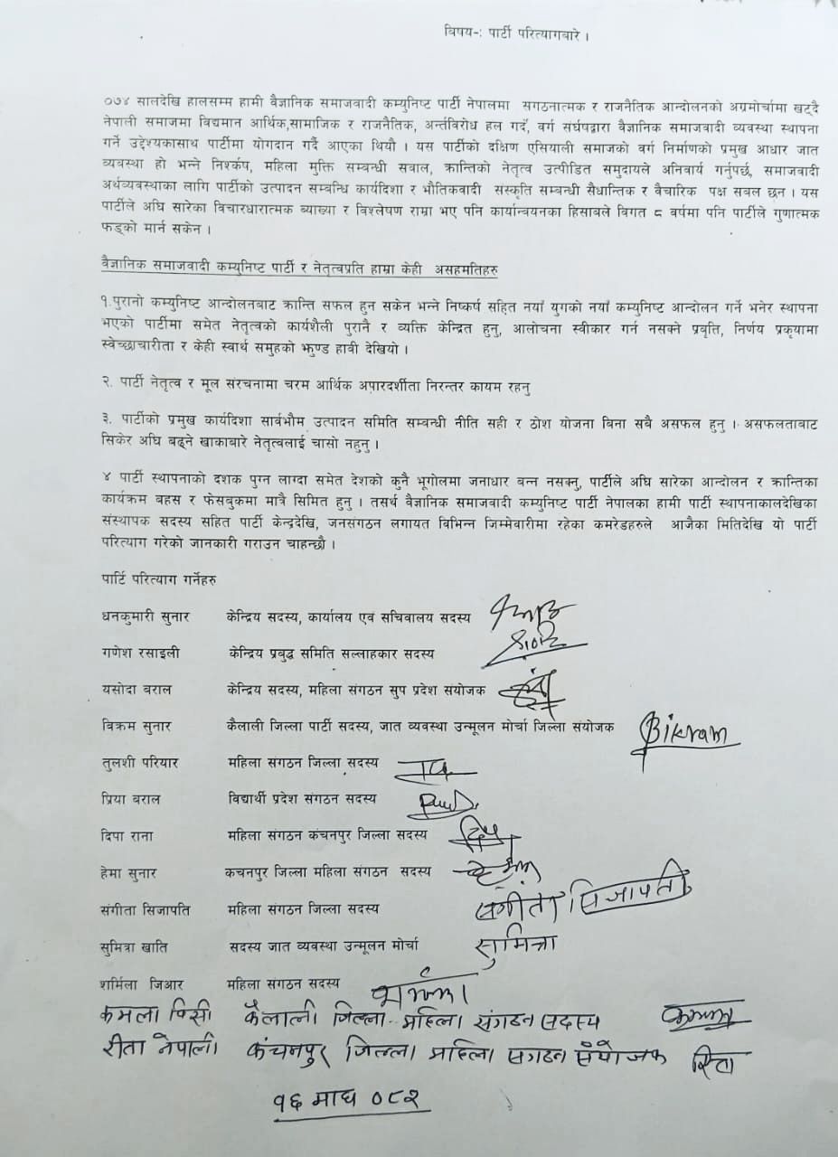पार्टी महासचिव विश्वभक्त दुलाल (आहुति) लाई सम्बोधन गर्दै जारी गरिएको विज्ञप्तिमा उनीहरूले पार्टीको नेतृत्व कार्यशैली, आर्थिक अपारदर्शिता र असफल कार्यान्वयनप्रति गम्भीर असहमति जनाउँदै आजकै मितिदेखि पार्टी परित्याग गरेको घोषणा गरेका हुन्।