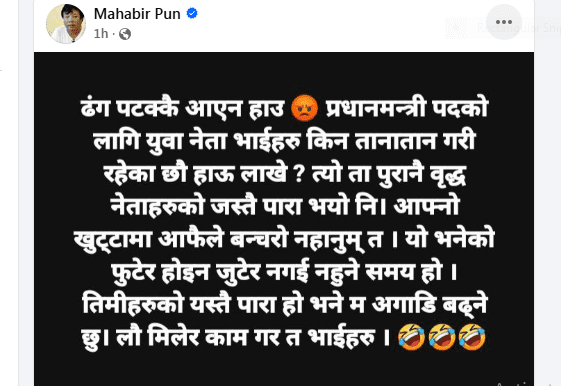 मन्त्री पुनले भनेका छन्, ‘ढंग पटक्कै आएन हाउ । प्रधानमन्त्री पदका लागि युवा नेता भाइहरू किन तानातान गरिरहेका छौ हाउ लाखे? यो त पुरानै वृद्ध नेताहरूको जस्तै पारा भयो नि । आफ्नो खुट्टामा आफैँ बन्चरो नहानुम् त । यो भनेको फुटेर होइन, जुटेर नगई नहुने समय हो ।’