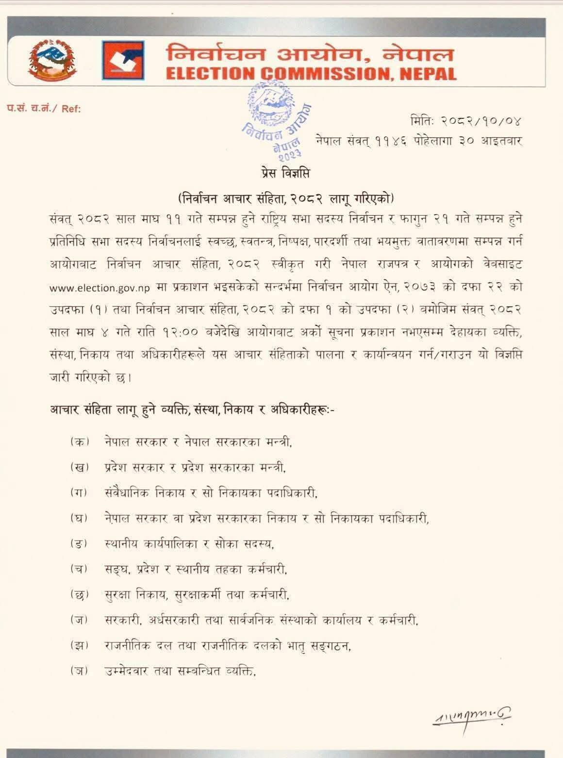 काठमाडौँ- आगामी फागुन २१ गते तोकिएको प्रतिनिधिसभा सदस्य निर्वाचनका लागि आइतबार मध्यरातिदेखि निर्वाचन आचारसंहिता, २०८२ लागु हुँदैछ।