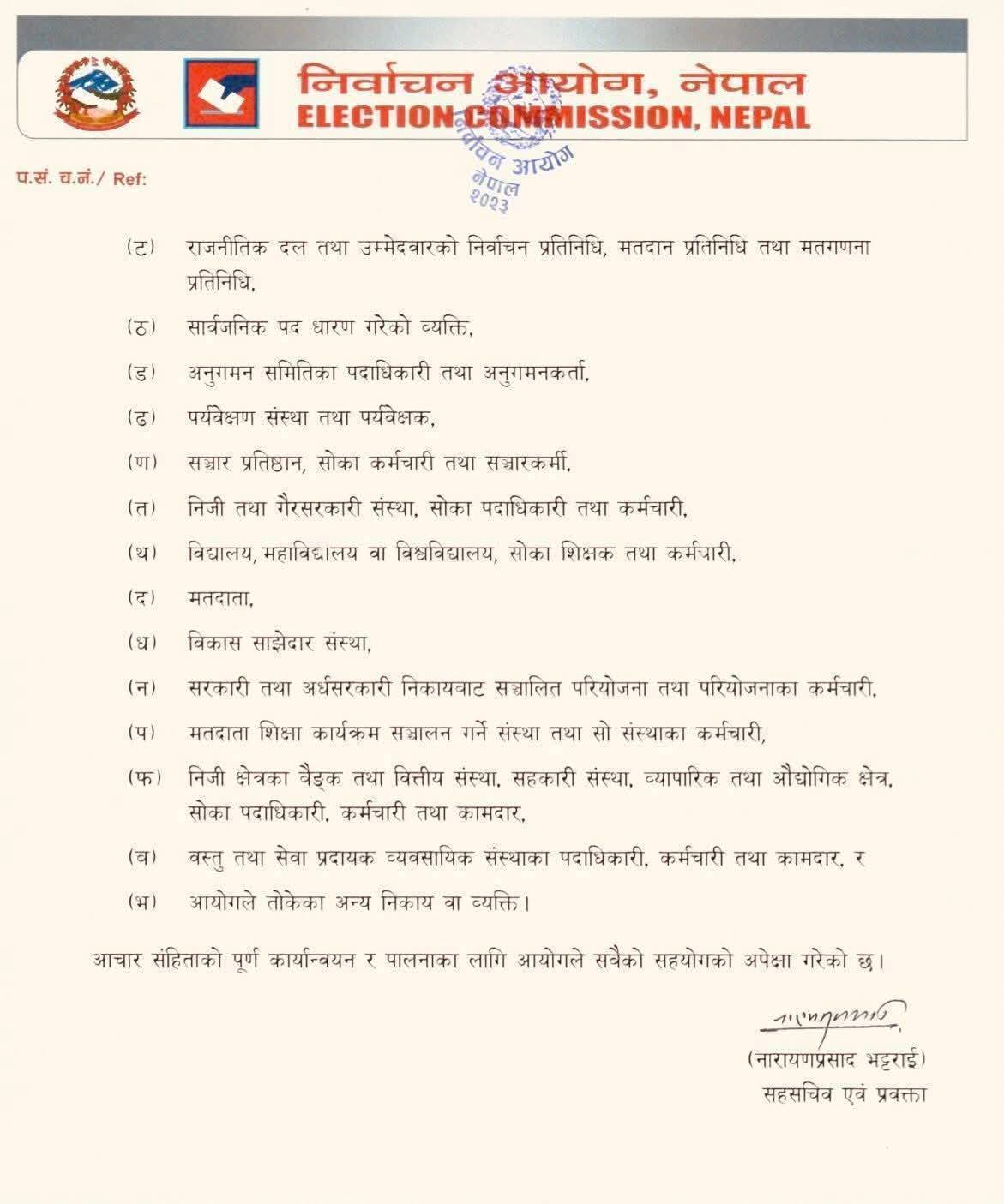 आयोगले जनाएअनुसार निर्वाचन आचारसंहिता नेपाल सरकार र नेपाल सरकारका मन्त्री, प्रदेश सरकार र प्रदेश सरकारका मन्त्री, संवैधानिक निकाय र सो निकायका पदाधिकारी, नेपाल सरकार वा प्रदेश सरकारका निकाय र सो निकायका पदाधिकारी, स्थानीय कार्यपालिका र सोका सदस्य, संघ, प्रदेश र स्थानीय तहका कर्मचारी, सुरक्षा निकाय, सुरक्षाकर्मी तथा कर्मचारी, सरकारी, अर्धसरकारी तथा सार्वजनिक संस्थाको कार्यालय र कर्मचारी, राजनीतिक दल तथा राजनीतिक दलको भातृ संगठन, उम्मेदवार तथा सम्बन्धित व्यक्तिलगायतले आचारसंहिता पालना गर्नुपर्नेछ।