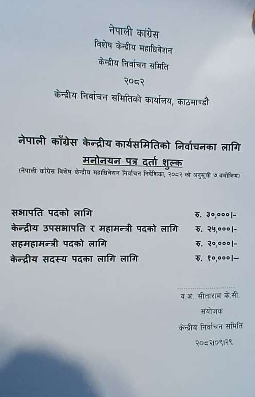 कांग्रेस सभापतिको उम्मेदवार शुल्क ३० हजार, महामन्त्रीका लागि २५ हजार [अरू पदमा कति?]