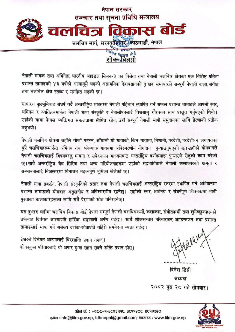 बोर्डका अध्यक्ष दिनेश डिसीले सोमबार शोक विज्ञप्ति जारी गर्दै उनको निधनले सम्पूर्ण नेपाली कला, संगीत तथा चलचित्र क्षेत्र स्तब्ध र मर्माहत भएको उल्लेख गरेका छन्।