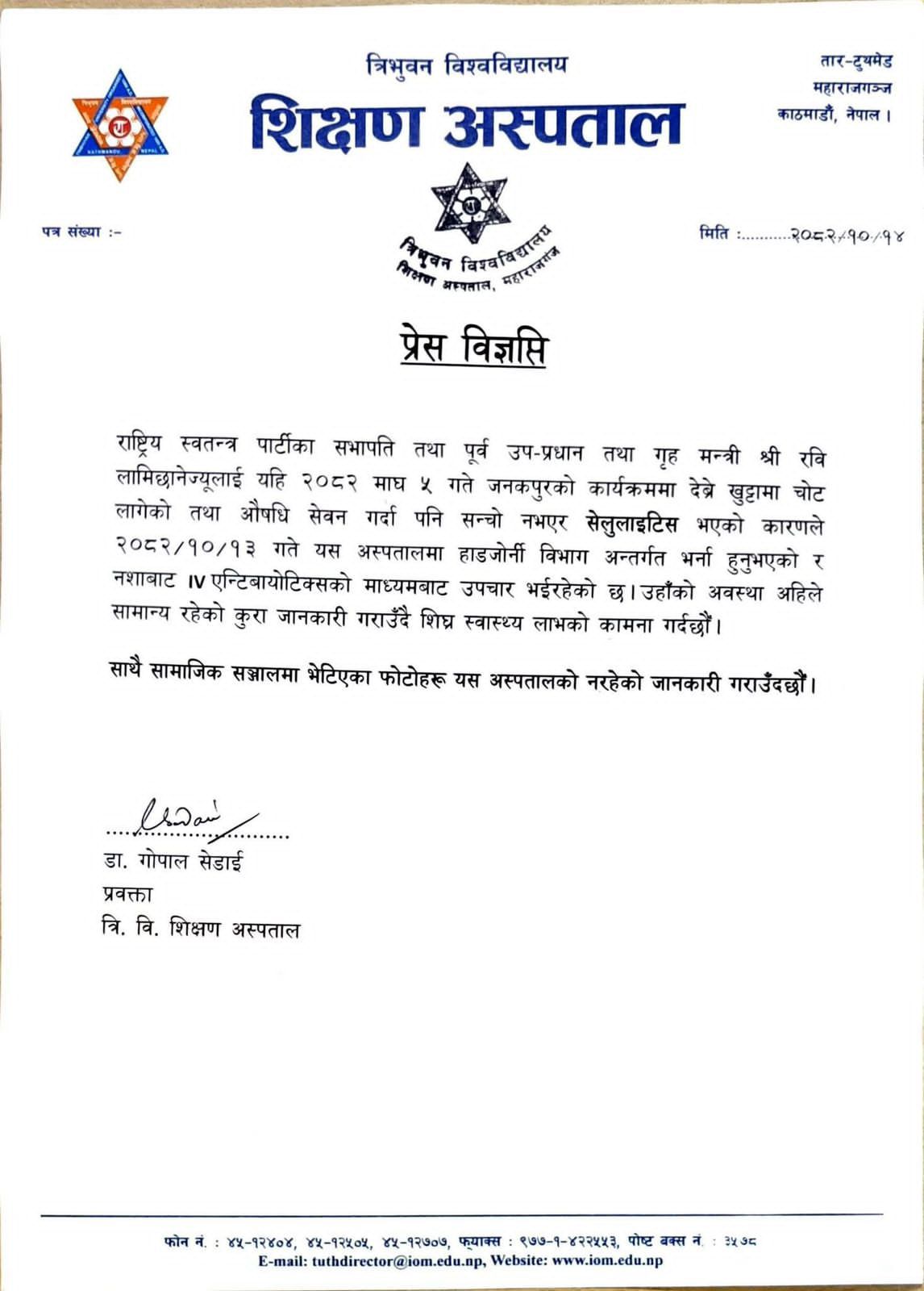 अस्पतालका प्रवक्ता डा.गोपाल सेडाईले जारी गरेको प्रेस विज्ञप्तिमा लामिछानेको स्वास्थ्य अवस्था हाल सामान्य रहेको उल्लेख गरिएको छ।