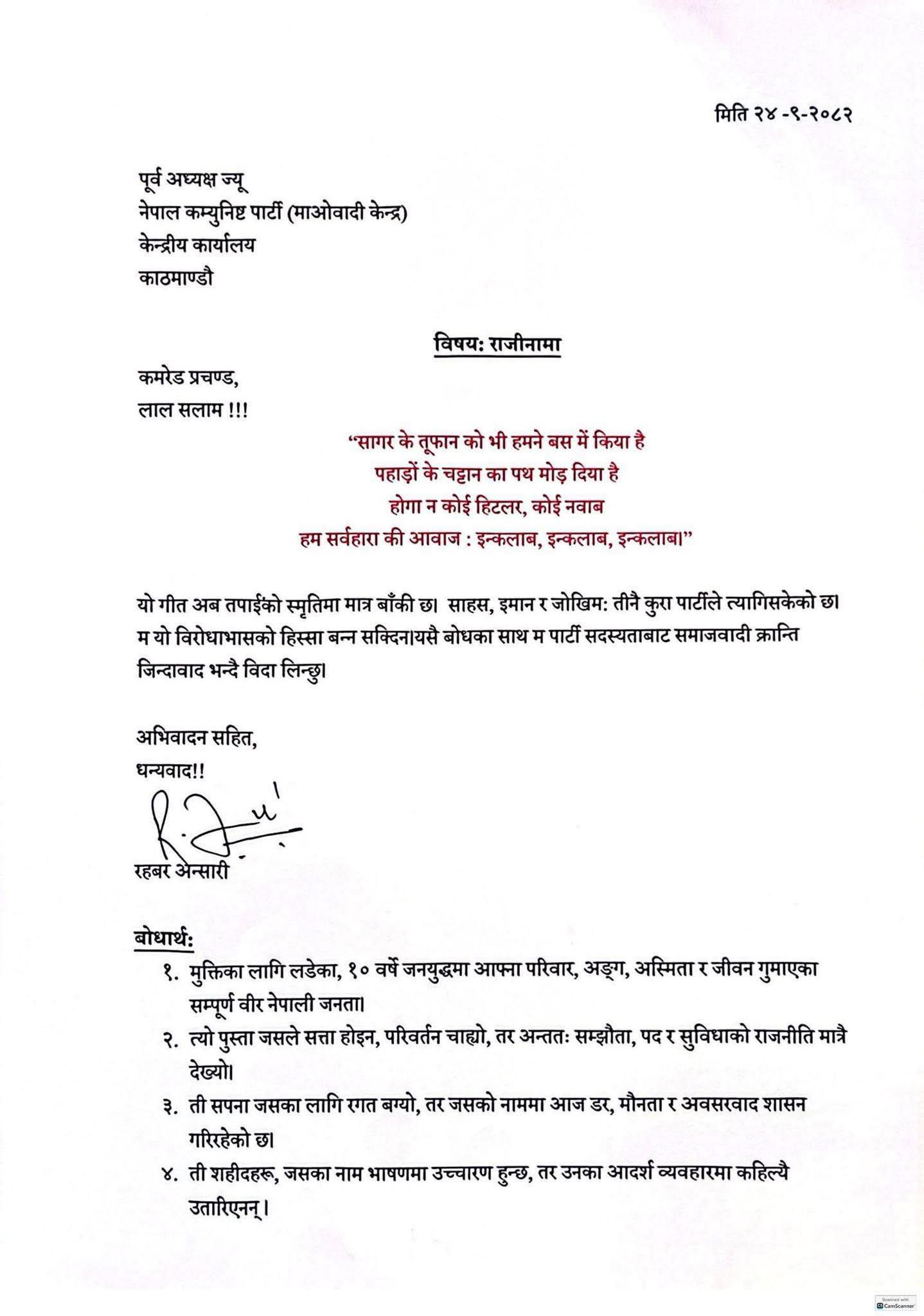 ‘यो गीत अब तपाईँको स्मृतिमा मात्र बाँकी छ, साहस, इमान र जोखिम तीनै कुरा पार्टीले त्यागिसकेको छ,’ प्रचण्डलाई सम्बोधन गर्दै उनले भनेका छन्,‘म यो विरोधाभासको हिस्सा बन्न सक्दिन। यसै बोधका साथ म पार्टी सदस्यताबाट समाजवादी क्रान्ति जिन्दाबाद भन्दै बिदा लिन्छु।’
