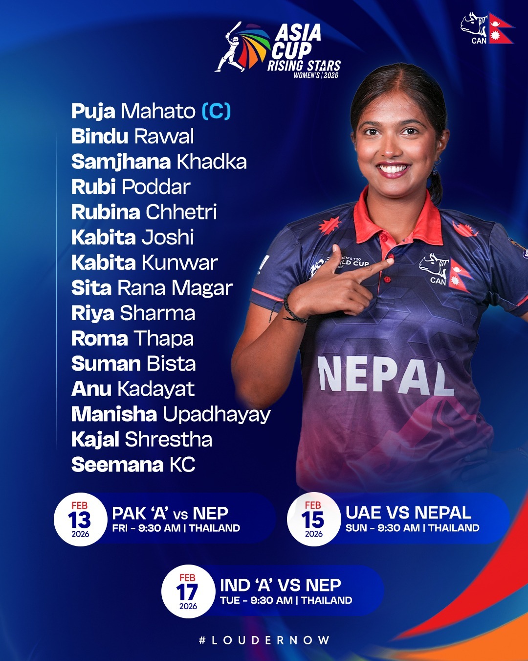 काठमाडौँ- एसीसी एसिया कप राइजिङ स्टार्स महिला २०२६ मा नेपाली क्रिकेट टोलीको कप्तानी पूजा महतोले गर्ने भएकी छिन्। नियमित कप्तान इन्दु बर्मा ह्यामिस्ट्रङ चोटका कारण मैदान बाहिर रहेपछि पूजाले कप्तानको जिम्मेवारी पाएकी हुन्। आईसीसी महिला टि ट्वान्टी विश्वकप छनोट अन्तर्गत गत साता स्कटल्याण्ड विरुद्धको अन्तिम खेलका दौरान इन्दु घाइते भएकी थिइन्। उनले ८ साता आराम गर्नुपर्ने भएको छ।