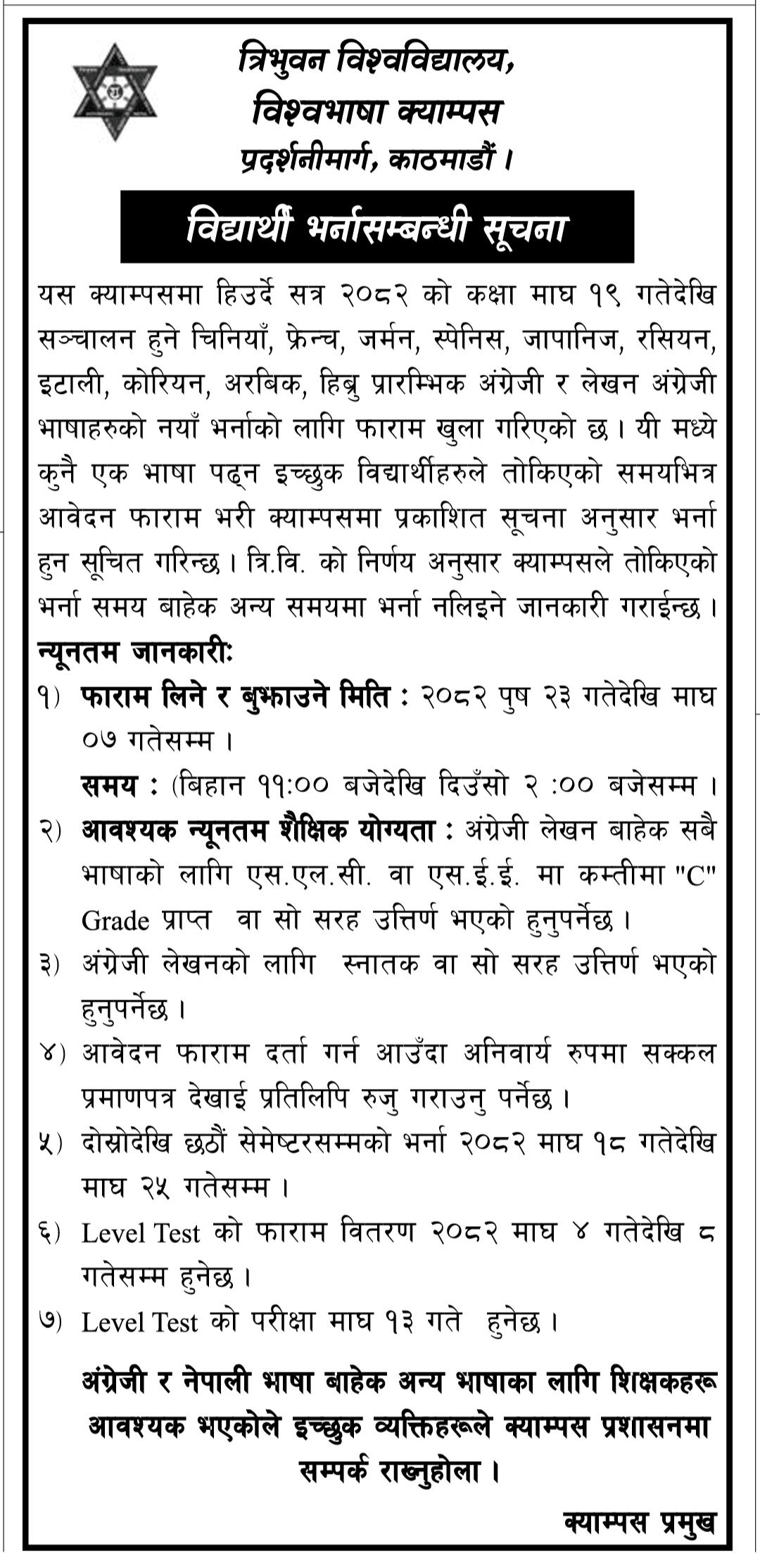 त्यसैगरी, लेभल टेस्टको फाराम वितरण माघ ४ गतेदेखि ८ गतेसम्म हुनेछ भने परीक्षा माघ १३ गते सञ्चालन गरिनेछ। त्रि.वि.को निर्णयअनुसार तोकिएको भर्ना समयबाहेक अन्य समयमा भर्ना नलिइने क्याम्पसले स्पष्ट पारेको छ।