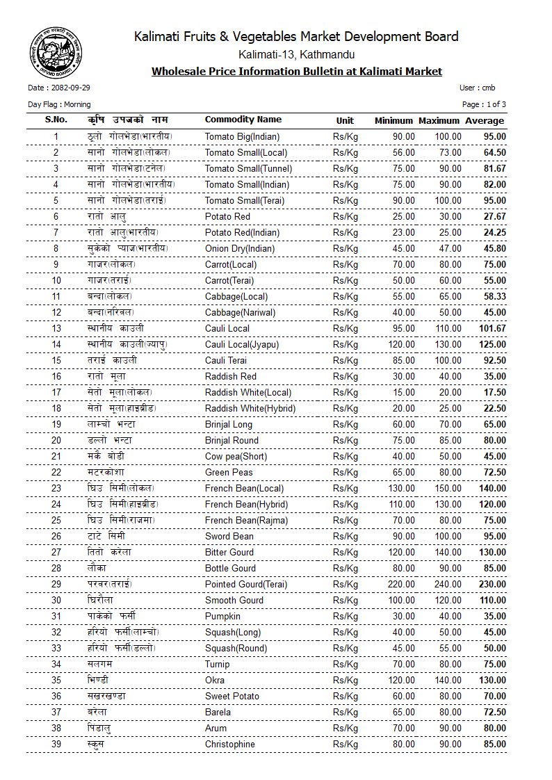 कालिमाटीमा हिजो सानो लोकल गोलभेँडा ७०, टनेलको सानो गोलभेँडा ८८, लोकल गाँजर ५६, लोकल बन्दा ५५, स्थानीय काउली ९३, लाम्चो भन्टा ७५, डल्ले भन्टा ८५, मकै बोडी ४५ रुपैयाँ प्रतिकिलो थियो।
