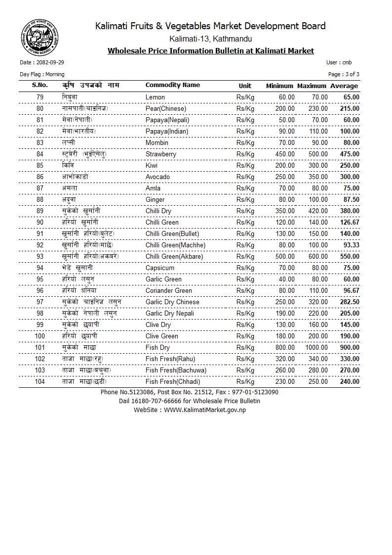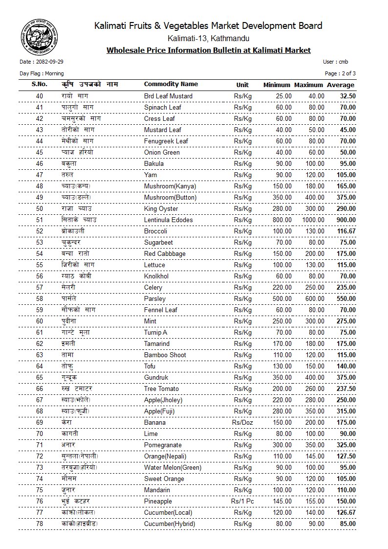 लौका ७५, घिरौँला ११०, डल्ले फर्सी ५०, पाकेको फर्सी ३५, भिन्डी १२५, कन्य च्याउ १६५, डल्ले च्याउ ४२५, ब्रोकाउली १०५, रुपैयाँ प्रतिकिलो थियो।