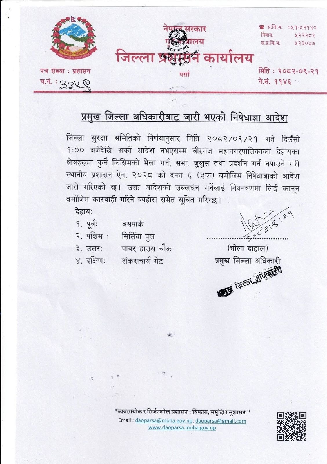 जिल्ला प्रशासन कार्यालयले बसपार्क पूर्व, सिर्सिया पुल पश्चिम, पावर हाउस चोक उत्तर र शंकराचार्य गेटको दक्षिणतर्फ निषेधाज्ञा जारी गरेको छ।