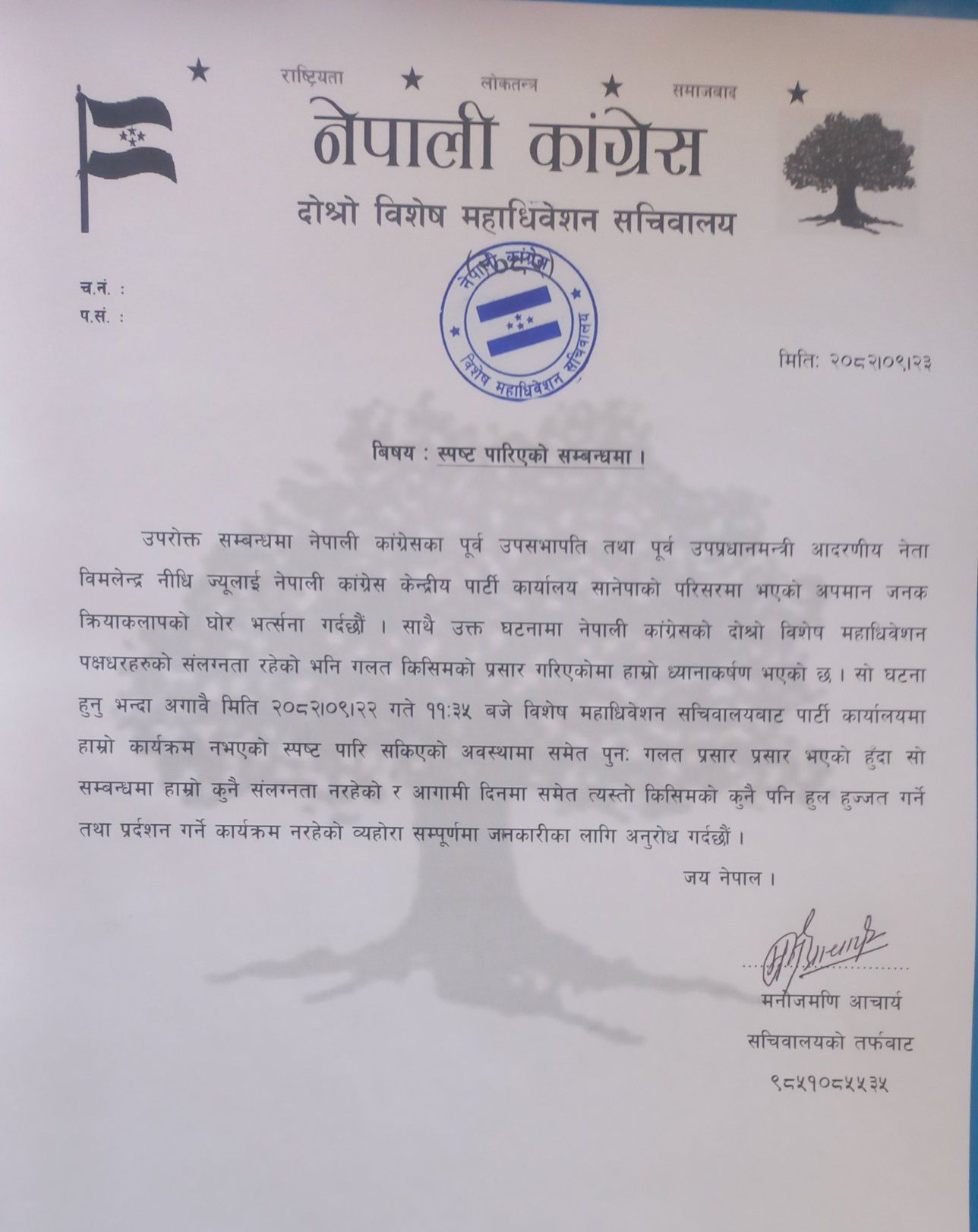 काठमाडौँ- नेपाली कांग्रेसको दोस्रो विशेष महाधिवेशन सचिवालयले पार्टीका पूर्वउपसभापति तथा पूर्वउपप्रधानमन्त्री बिमलेन्द्र निधिमाथि पार्टी केन्द्रीय कार्यालय सानेपाको परिसरमा मंगलबार भएको अपमानजनक क्रियाकलापको घोर भर्त्सना गरेको छ।