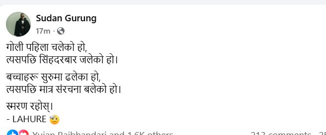त्यसको जबाफ स्वरूप सुदनले पहिले गोली चलेको र त्यसपछि मात्र सिंहदरबार जलेको जबाफ फर्काएका हुन्। सुदनले र्याप गायक लाहुरेको भनाइ उदृत गर्दै बच्चाहरू सुरुमा ढलेका हो, त्यसपछि मात्र संरचना बलेको हो समेत भनेका छन्। उनले भदौ २३ र २४ को घटनालाई आधार बनाएर ओलीलाई जबाफ दिएका छन्।
