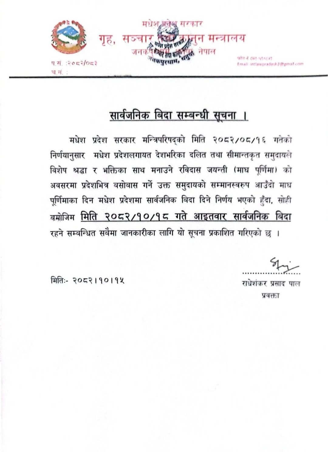 सरकारले दलित तथा सीमान्तकृत समुदायले मनाउने रविदास जयन्ती (माघ पूर्णिमा) को अवसरमा बिदा दिने निर्णय गरेको हो।