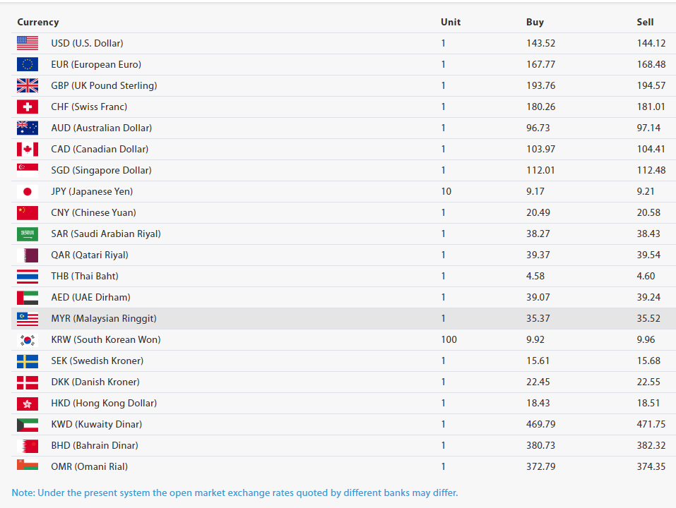 काठमाडौँ- नेपाल राष्ट्र बैंकले आज (बिहीबार) का लागि विदेशी मुद्राहरूको विनिमयदर निर्धारण गरेको छ। आज अमेरिकी डलर १ को खरिददर १४३ रुपैयाँ ५२ पैसा र बिक्रीदर १४४ रुपैयाँ १२ पैसा छ।