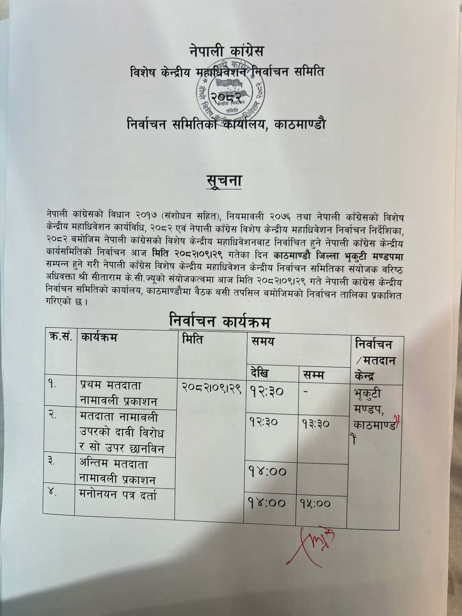 काठमाडौँ- नेपाली कांग्रेस विशेष महाधिवेशनको निर्वाचन कार्यतालिका सार्वजनिक गरिएको छ।