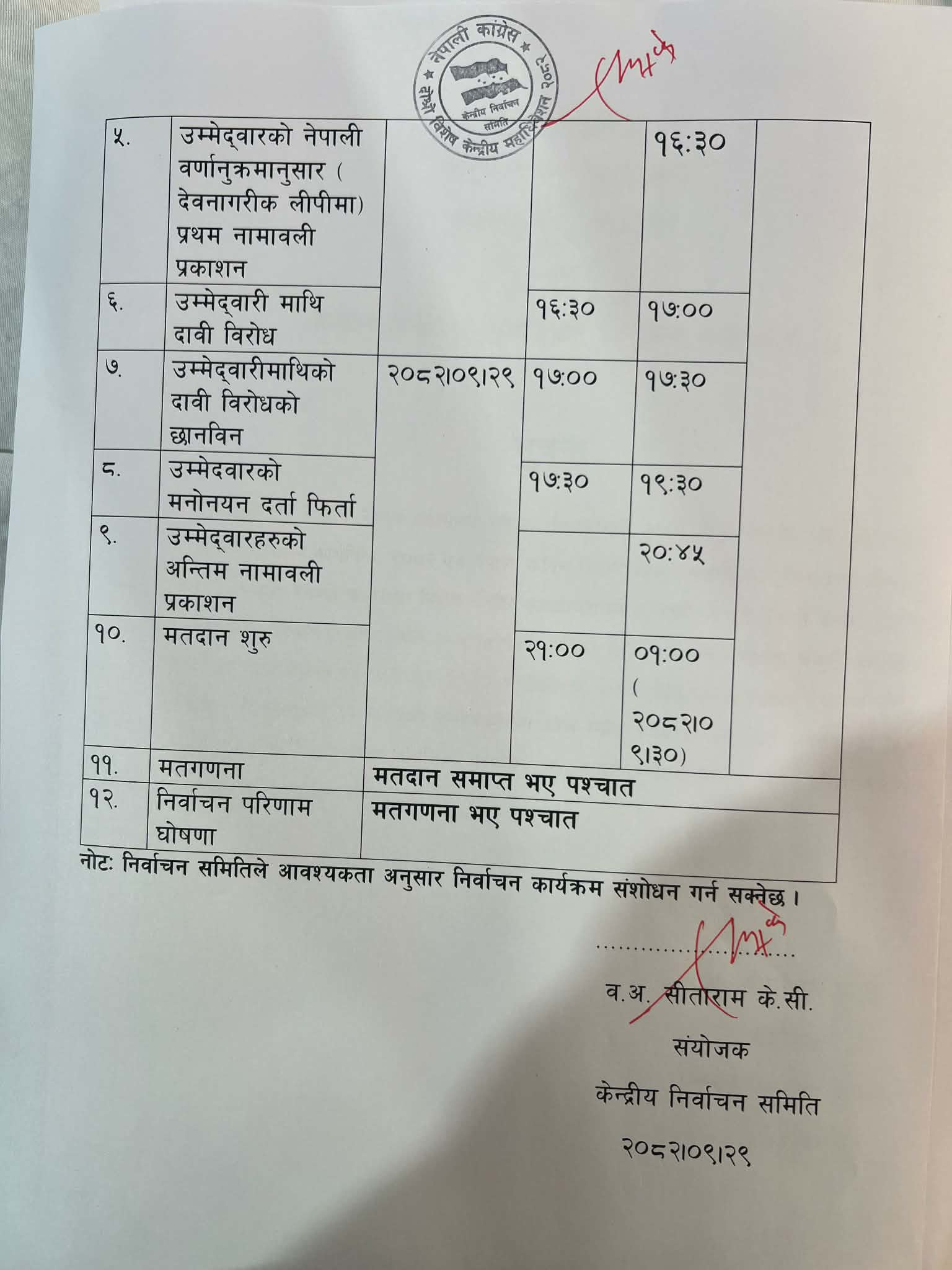 निर्वाचन समितिले आवश्यक परेमा कार्यक्रममा संशोधन गर्न सक्ने जनाएको छ। संयोजक केसीले निर्वाचन पारदर्शी, निष्पक्ष हुने प्रतिबद्धता व्यक्त गरेका छन्।