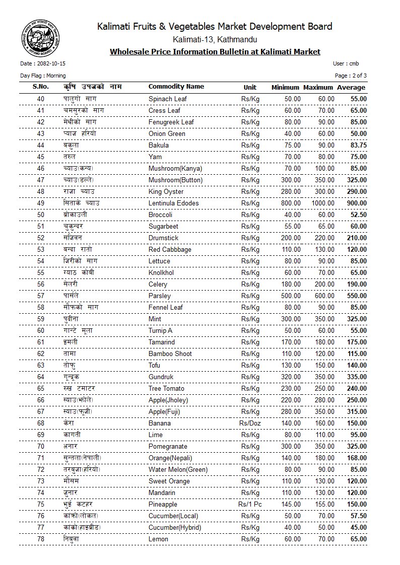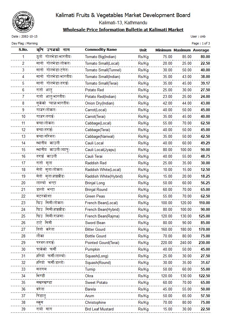 कालिमाटीमा हिजो ठूलो भारतीय गोलभेँडा ७५, सानो लोकल गोलभेँडा २२, टनेलको सानो गोलभेँडा ५२, रातो आलु २८, भारतीय रातो आलु २४, भारतीय सुकेको प्याज ४३, लोकल बन्दा ६१, स्थानीय काउली ६३, लाम्चो भन्टा ५१, डल्ले भन्टा ५७ रुपैयाँ प्रतिकिलो थियो।
