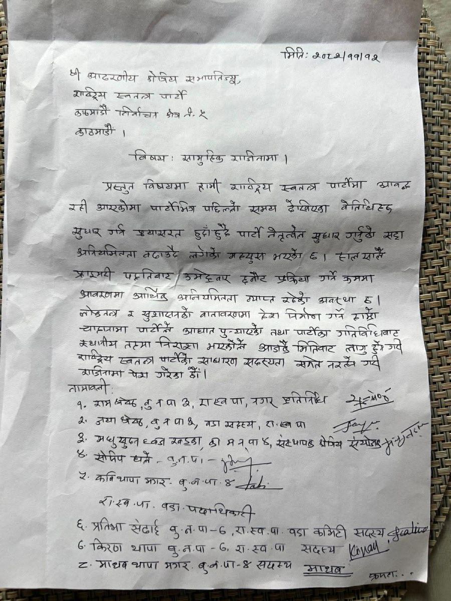काठमाडौँ- राष्ट्रिय स्वतन्त्र पार्टी (रास्वपा) काठमाडौँ ५ का संस्थापक क्षेत्रीय संयोजक सहित १४ जनाले सामूहिक राजीनामा दिएका छन्। उनीहरूले राजीनामा पत्रमा प्रतिनिधि सभा उम्मेदवार छनोटका आवरणमा आर्थिक अनियमितता समेत भएको आरोप नेतृत्वमाथि लगाएका छन्। यसैगरी, लोकतन्त्र र सुशासनको वातावरणमा देश निर्माण गर्ने चाहनामा पार्टीले आघात पुर्याएको भन्दै राजीनामा पत्रमा पार्टीका स्थानीय गतिविधिबाट आघात भएकाले आजैबाट राजीनामा दिइएको उल्लेख छ।