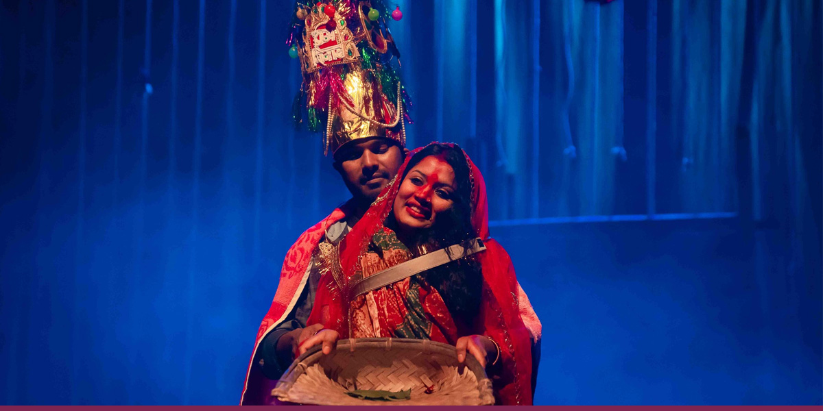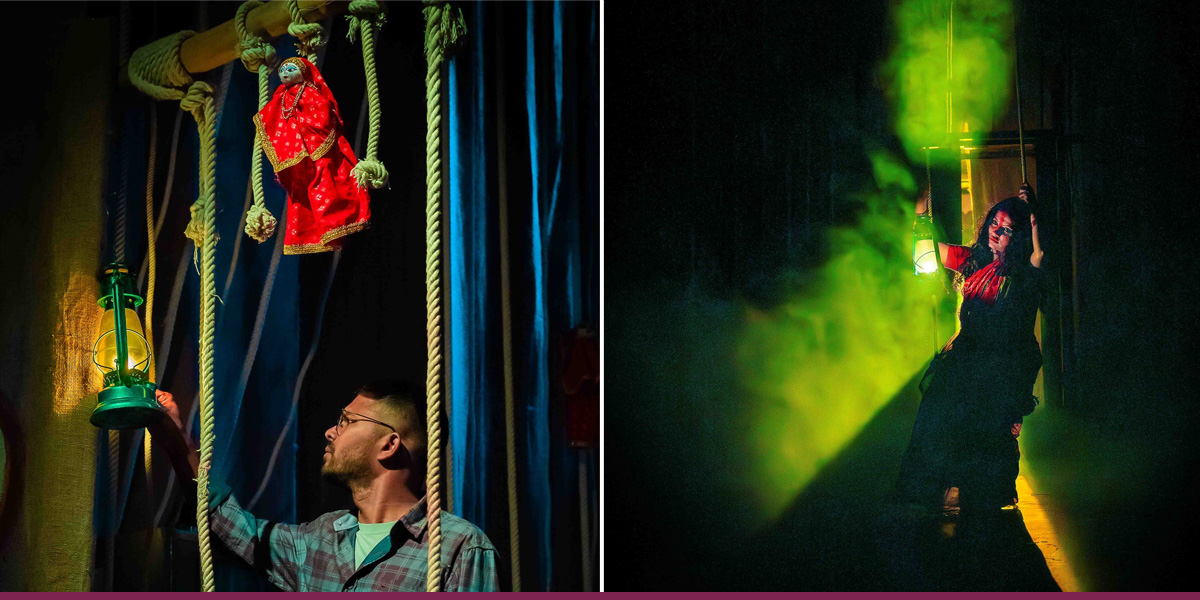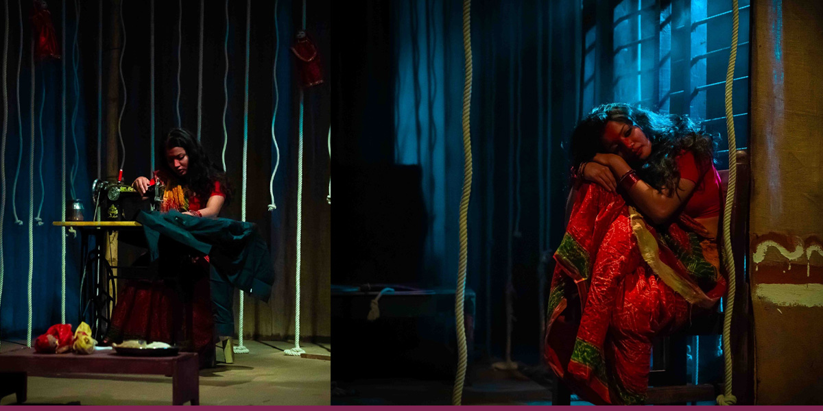 कोठाभित्र चारैतिर डोरी झुन्ड्याइएको छ, जसमा विवाहको पहिरनमा सजिएका महिला र पुरुषको कठपुलती झुन्डिराखेका छन्। बिम्बात्मकरूपमा निर्देशकले यसलाई पुरुषको कठपुतली बनिरहेका आम महिलाको प्रतिनिधि पात्रको रूपमा संकेत गरेका छन्। कोठामा बाहिर निस्किने ढोका पनि बन्द नै छ। त्यस्तै अँध्यारो देखाउन मञ्चमा प्रयोग गरिएको प्रकाशको मधुरोपनले पनि पात्रको मानसिकता अभिव्यक्त गरिरहेको छ।
