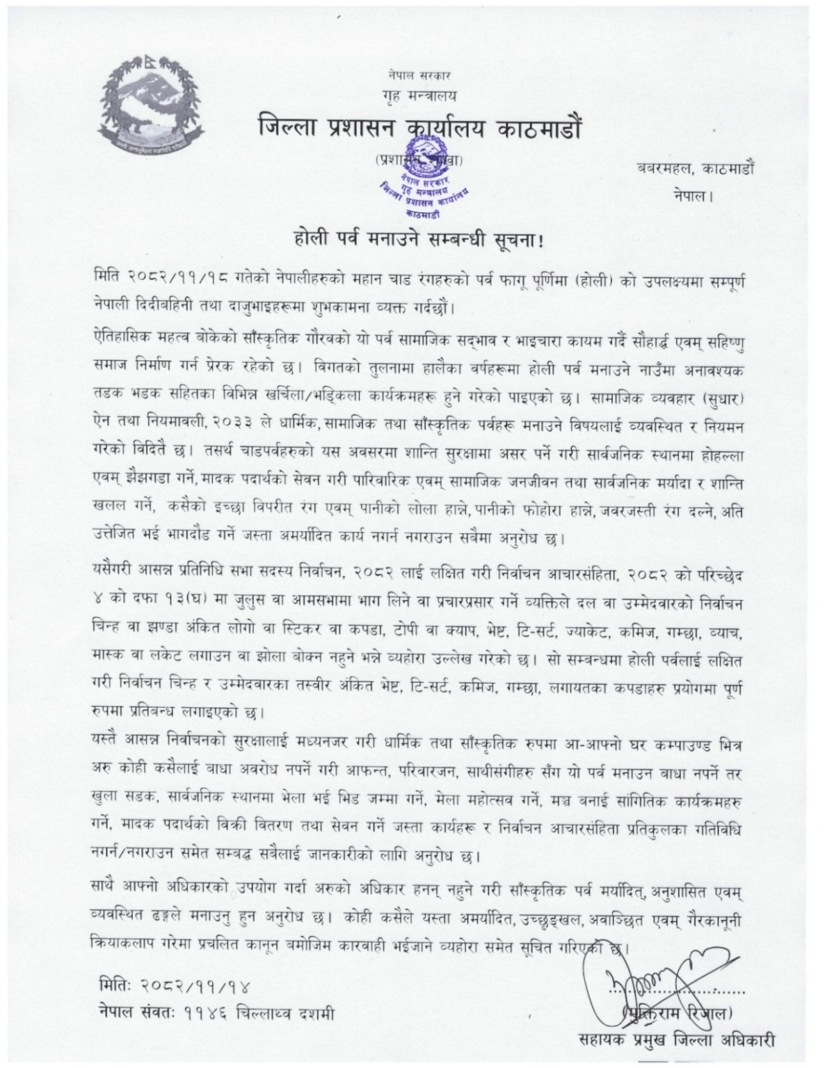 प्रशासनले निर्वाचन आचारसंहिताको हवाला दिँदै होली पर्वको समयमा कुनै पनि राजनीतिक दल वा उम्मेदवारको निर्वाचन चिह्न  वा तस्बिर अंकित भेष्ट, टिसर्ट, कमिज, गम्छा, टोपी, मास्क वा लकेट लगाउन र प्रयोग गर्न पूर्ण रोक लगाएको छ।