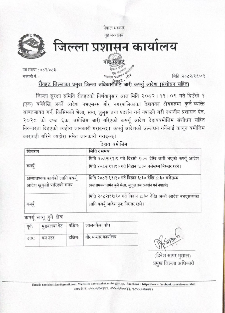 यसपछि बिहान साढे ८ बजेदेखि भने कर्फ्यु अर्को आदेश नभएसम्मका लागि निरन्तर रहनेछ। गौर नगरपालिकाको पूर्वमा मुडबलवा गेट, पश्चिममा लालवकैया बाँध, उत्तरमा बम नहर र दक्षिणमा गौर भन्सार कार्यालयको चार किल्लामा कर्फ्यु लगाइएको हो। यो क्षेत्रमा कुनै पनि व्यक्तिलाई आवतजावत गर्न, भेला, सभा, जुलुस तथ प्रदर्शन गर्न रोक लगाइएको छ।