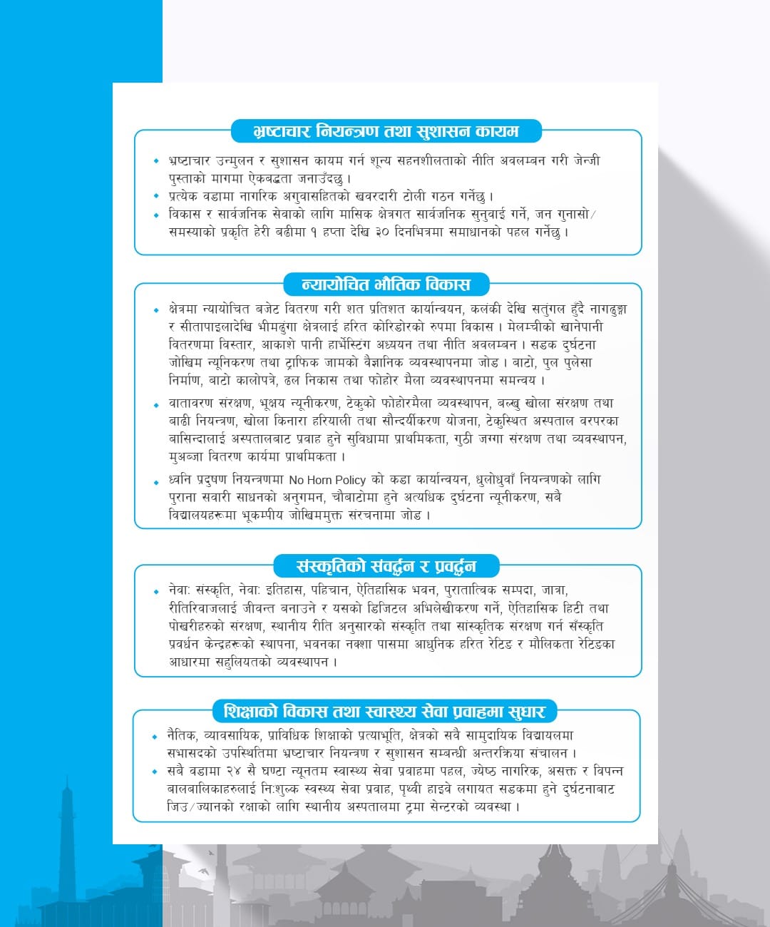 त्यस्तै, नेवाः संस्कृति, इतिहास र सम्पदाको डिजिटल अभिलेखीकरण गर्ने, संस्कृति प्रवर्द्धन केन्द्रहरुको स्थापना, भवनका नक्सा पासमा आधुनिक हरित रेटिङ र मौलिकता रेटिङका आधारमा सहुलियतको व्यवस्थापन गर्ने प्रतिबद्धता जनाइएको छ।