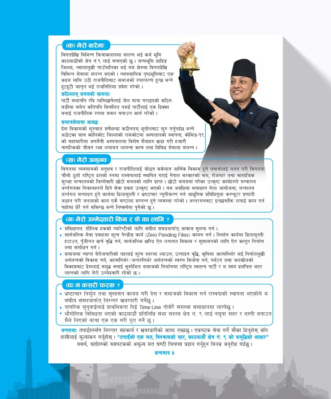 काठमाडौँ- राष्ट्रिय स्वतन्त्र पार्टी (रास्वपा) का उपसभापति एवं काठमाडौँ क्षेत्र नं. ९ का प्रतिनिधि सभा सदस्य उम्मेदवार डोलप्रसाद अर्याल (डीपी) ले आफ्नो चुनावी वाचापत्र सार्वजनिक गरेका छन्। ‘तपाईंको एक मत, विश्वासको सार, काठमाडौँ क्षेत्र नं. ९ को समृद्धिको आधार’ भन्ने मुख्य संकल्पका साथ अर्यालले मंगलबार वाचापत्र सार्वजनिक गरेका हुन्।