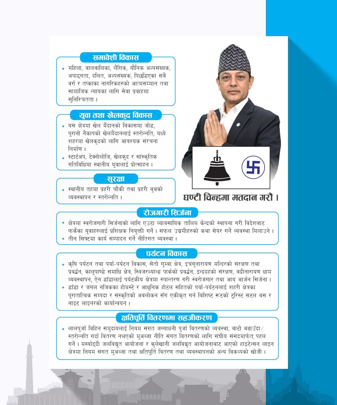 यसका साथै लालपूर्जाविहीन समुदायलाई नियमसंगत जग्गाधनी पूर्जा वितरणको व्यवस्था, सडक स्तरोन्नति गर्दा वितरण नभएका मुआब्जा नीतिसंगत वितरणका लागि संघीय संसद्मार्फत पहल गर्ने, जलविद्युतका हाइटेन्सन लाइनबाट प्रभावित स्थानीयलाई नियमसंगत मुआब्जा र क्षतिपूर्ति वितरण तथा व्यवस्थापनको विकल्प खोजी गर्ने उनको प्रतिबद्धता छ। साथै उनले समावेशी, विकास, युवा तथा खेलकुद र सुरक्षाका विषयलाई पनि वाचापत्रमा समेटेका छन्।