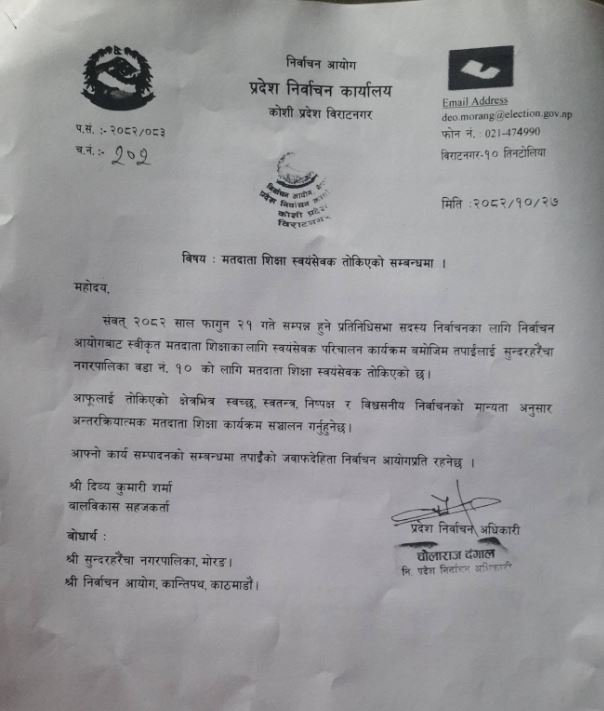 कार्यालयले जारी गरेको पत्रअनुसार सुन्दरहरैंचा-१० मा मतदाता शिक्षा स्वयंसेवकको रूपमा दिव्य कुमारी शर्मालाई तोकिएको छ।