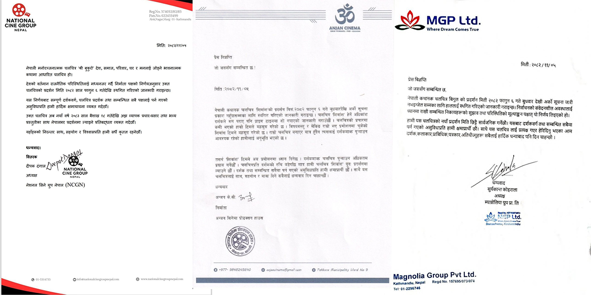 यसैबीच फागुन १ देखि प्रदर्शन भएको ‘श्री बुकुरो’, ‘शिवांश’ र ‘बिगुल’ टिमले एकसाथ फिल्म हलबाट उतारेका छन्।