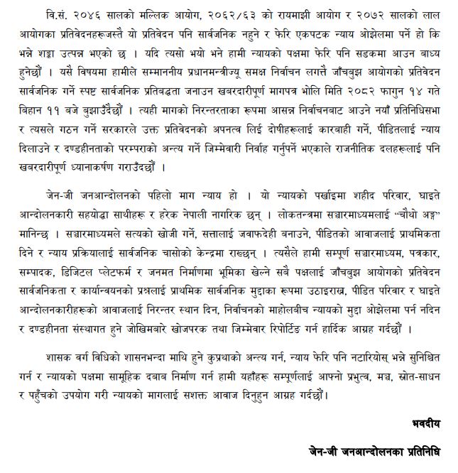 भ्रष्टाचार निवारण र डिजिटल स्वतन्त्रताका लागि भएको सो आन्दोलनपछि गठित अन्तरिम सरकारले फागुन २१ को निर्वाचन लगत्तै फागुन २२ भित्रै प्रतिवेदन सार्वजनिक गर्नुपर्ने माग राख्दै उनीहरूले आज प्रधानमन्त्रीलाई खबरदारीपूर्ण मागपत्र बुझाउने तयारी गरेका छन्।