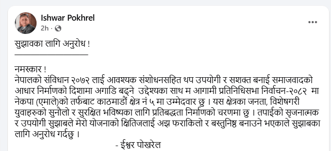 काठमाडौँ- एमाले पूर्ववरिष्ठ उपाध्यक्ष एवं काठमाडौँ निर्वाचन क्षेत्र नम्बर–५ का उम्मेदवार ईश्वर पोखरेलले संविधान संशोधनका लागि उम्मेदवारी दिएको भन्दै सुझावको मागेका छन्। आफू प्रतिवद्धतापत्र निर्माणको क्रममा रहेको भन्दै नेता पोखरेलले सर्वसाधारण र मतदातासँग सुझाव मागेका हुन् ।