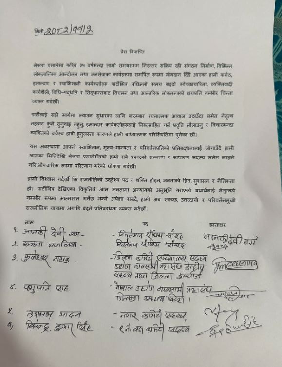 पार्टीभित्र बढ्दो स्वेच्छाचारिता, व्यक्तिवादी कार्यशैली, विधिपद्धति र सिद्धान्तबाट विचलित तथा आन्तरिक लोकतन्त्रको क्षयीकरणप्रति गम्भीर चिन्ता व्यक्त गर्दै आफूहरू पार्टी परित्याग गर्न बाध्य भएको विज्ञप्तिमा उल्लेख छ।