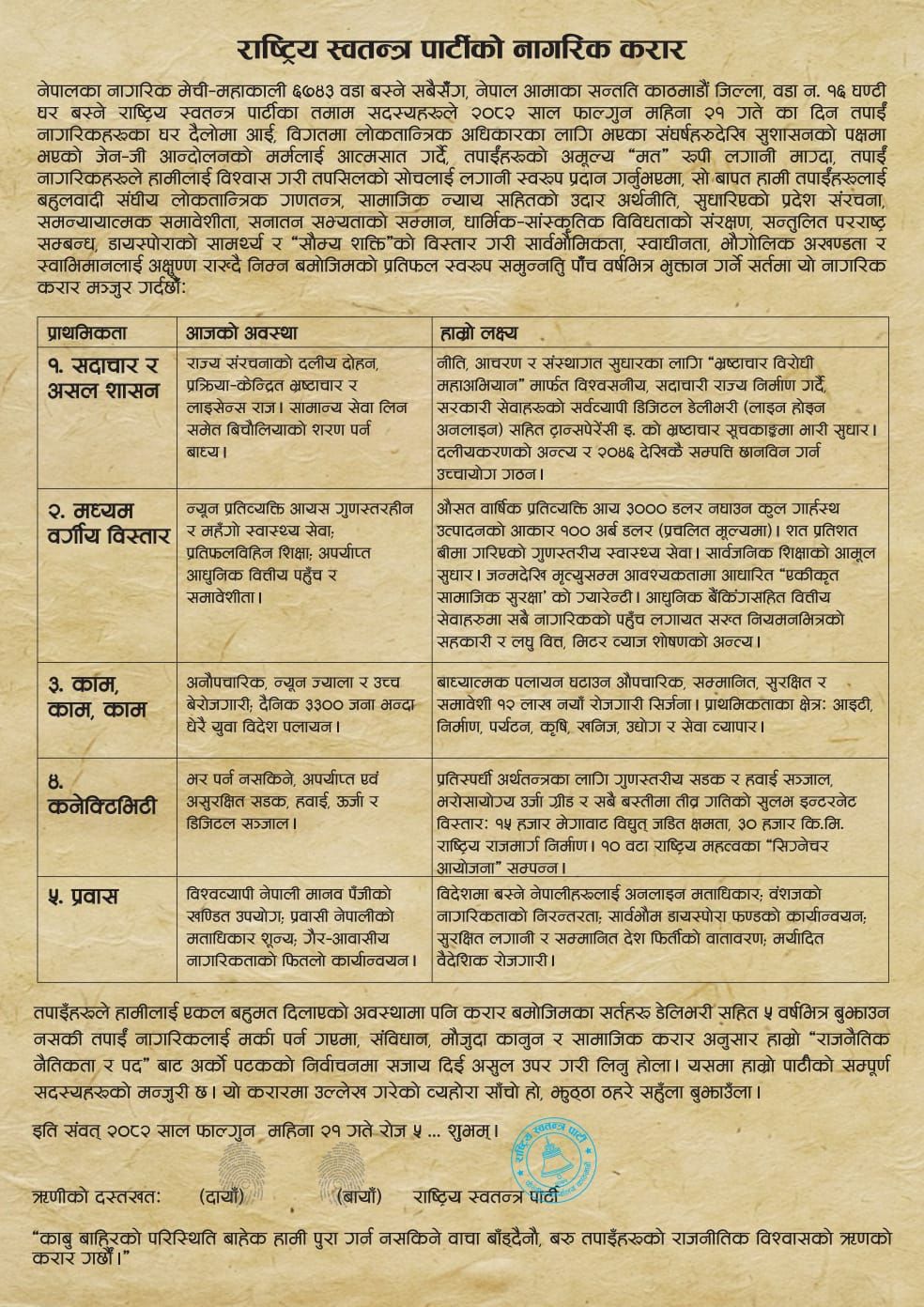 यसअघि सभापति रवि लामिछानेले निर्वाचनका लागि घोषणापत्रअघि नागरिक करार पत्र ल्याउने बताएका थिए। सोहीअनुरूप रास्वपाले नागरिक करार पत्र सार्वजनिक गरेको हो।