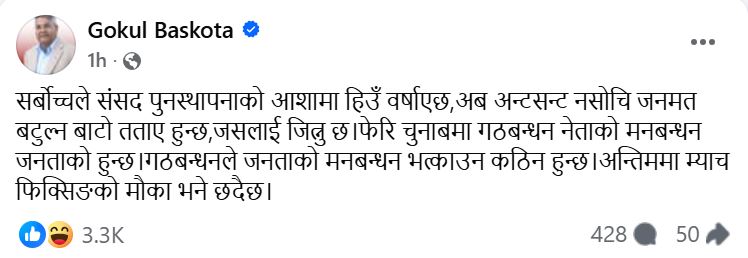‘सर्वोच्चले संसद् पुनःस्थापनाको आशामा हिउँ वर्षाएछ,’ उनले सामाजिक सञ्जालमा लेखेका छन्, ‘अब अन्टसन्ट नसोचि जनमत बटुल्न बाटो तताए हुन्छ, जसलाई जित्नु छ।’ बाँस्कोटाले भनेका छन्। उनले गठबन्धनतिर नलाग्ने सुझाव पनि दिएका छन्। ‘फेरि चुनावमा गठबन्धन नेताको, मनबन्धन जनताको हुन्छ। गठबन्धनले जनताको मनबन्धन भत्काउन कठिन हुन्छ। अन्तिममा म्याच फिक्सिङको मौका भने छँदैछ।’ बाँस्कोटाले लेखेका छन्।