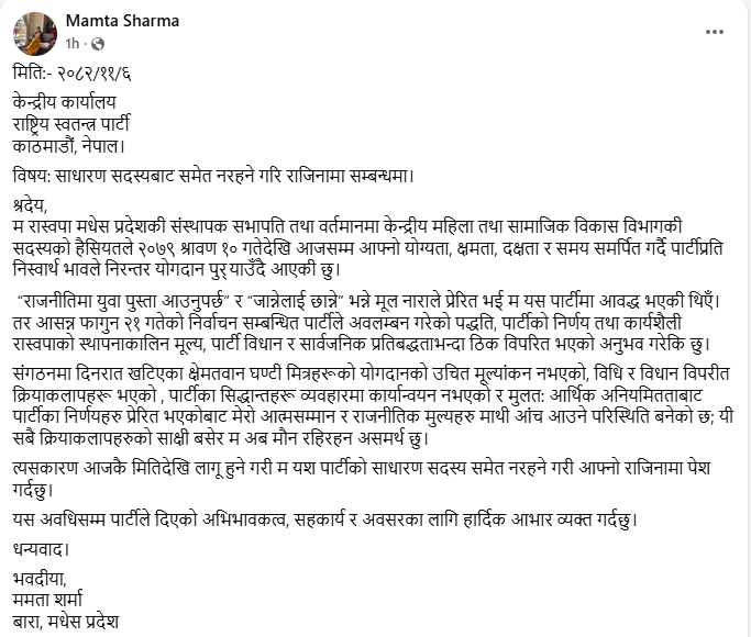 ‘राजनीतिमा युवा पुस्ता आउनुपर्छ र जान्नेलाई छान्ने भन्ने मूल नाराले प्रेरित भई म यस पार्टीमा आबद्ध भएकी थिएँ। तर आसन्न फागुन २१ गतेको निर्वाचन सम्बन्धित पार्टीले अवलम्बन गरेको पद्धति, पार्टीको निर्णय तथा कार्यशैली रास्वपाको स्थापनाकालीन मूल्य, पार्टी विधान र सार्वजनिक प्रतिबद्धताभन्दा ठिकविपरीत भएको अनुभव गरेको छु। संगठनमा दिनरात खटिएका क्षमतावान् घण्टी मित्रहरूको योगदानको उचित मूल्यांकन नभएको, विधि र विधानविपरीत क्रियाकलापहरू भएको, पार्टीका सिद्धान्तहरू व्यवहारमा कार्यान्वयन नभएको र मूलत: आर्थिक अनियमितताबाट पार्टीका निर्णयहरू प्रेरित भएकोबाट मेरो आत्मसम्मान र राजनीतिक मूल्यहरूमाथि आँच आउने परिस्थिति बनेको छ,’ उनले भनिन्, यी सबै क्रियाकलापहरूको साक्षी बसेर म अब मौन रहिरहन असमर्थ छु। त्यसकारण आजकै मितिदेखि लागु हुने गरी म यस पार्टीको साधारण सदस्यसमेत नरहने गरी आफ्नो राजीनामा पेस गर्दछु।’