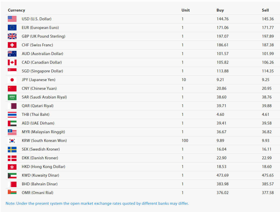 काठमाडौँ- नेपाल राष्ट्र बैंकले आज (सोमबार) का लागि विदेशी मुद्राहरूको विनिमयदर निर्धारण गरेको छ। आज अमेरिकी डलर १ को खरिददर १४४ रुपैयाँ ७६ पैसा र बिक्रीदर १४५ रुपैयाँ ३६ पैसा छ।