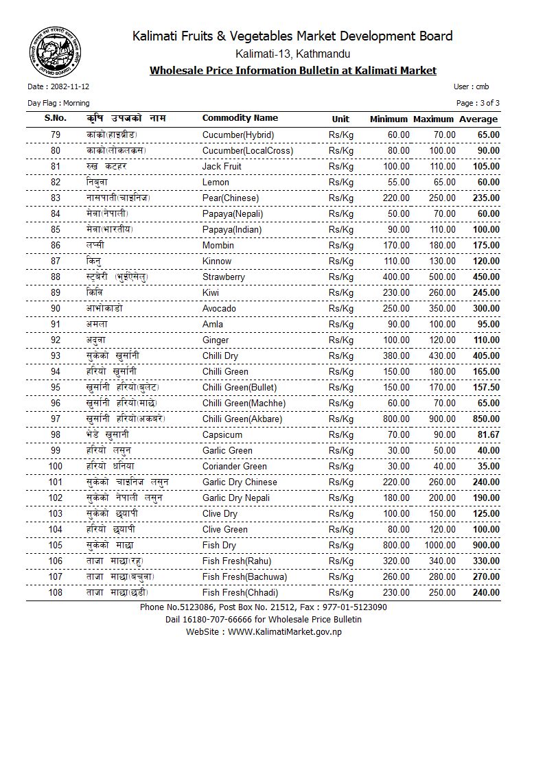 करेला १७०, लौका ६७, घिरौँला १३५, डल्ले फर्सी १९, पाकेको फर्सी ५०, भिन्डी १२२, कन्य च्याउ १२०, डल्ले च्याउ ३७५, सिताके च्याउ ९००, ब्रोकाउली ३० रुपैयाँ प्रतिकिलो छ।