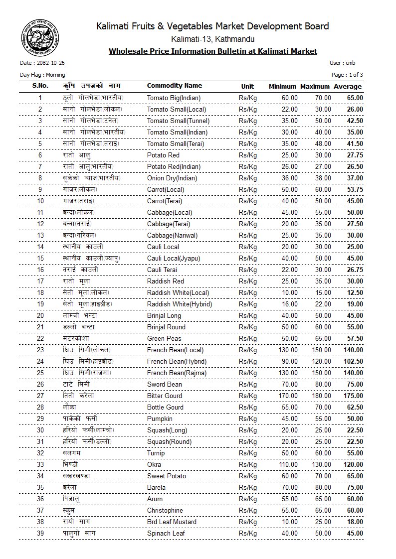 हेर्नुहोस् तरकारी तथा फलफूलहरूको आजको मूल्यसूची