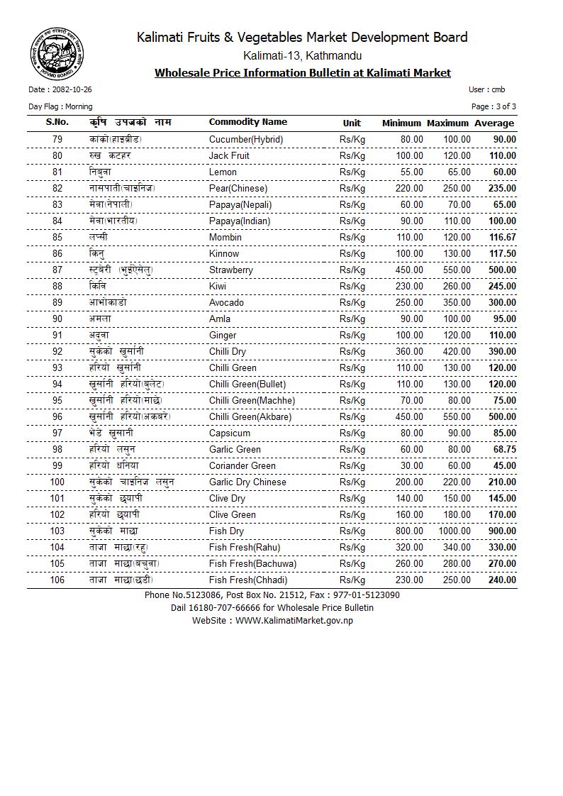 करेला १७५, लौका ६५, डल्ले फर्सी २५, पाकेको फर्सी ५०, भिन्डी १२०, कन्य च्याउ ९०, डल्ले च्याउ ३२५, सिताके च्याउ ९००, ब्रोकाउली ४८ रुपैयाँ प्रतिकिलो थियो।