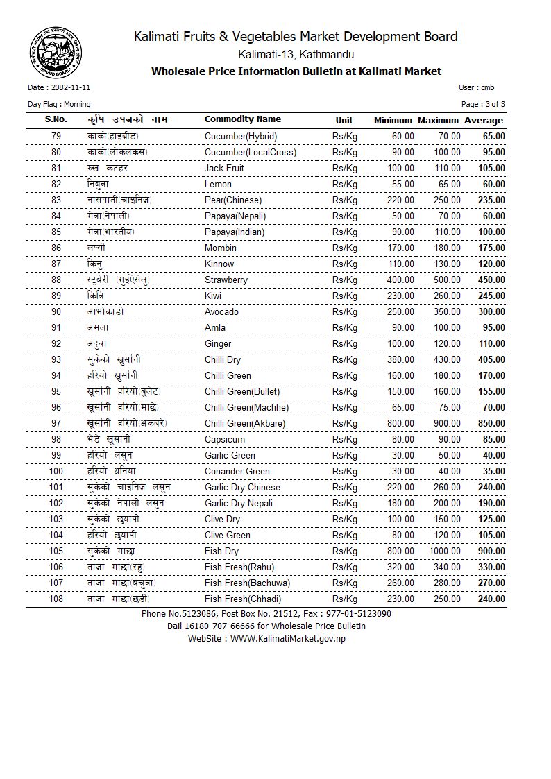 करेला १७०, लौका ७०, घिरौँला १३५, डल्ले फर्सी १६, पाकेको फर्सी ५०, भिन्डी १२५, कन्य च्याउ १२०, डल्ले च्याउ ४०५, सिताके च्याउ ९१२, ब्रोकाउली ४० रुपैयाँ प्रतिकिलो थियो।