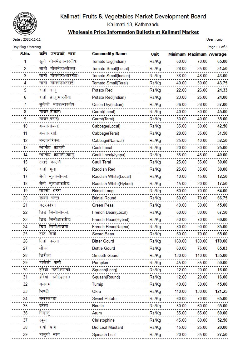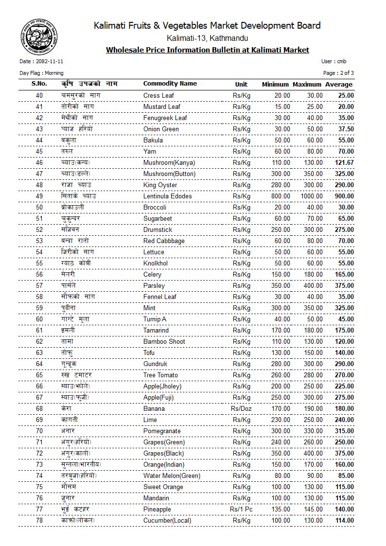 करेला १७०, लौका ७०, घिरौँला १३५, डल्ले फर्सी १६, पाकेको फर्सी ५०, भिन्डी १२५, कन्य च्याउ १२०, डल्ले च्याउ ४०५, सिताके च्याउ ९१२, ब्रोकाउली ४० रुपैयाँ प्रतिकिलो थियो।