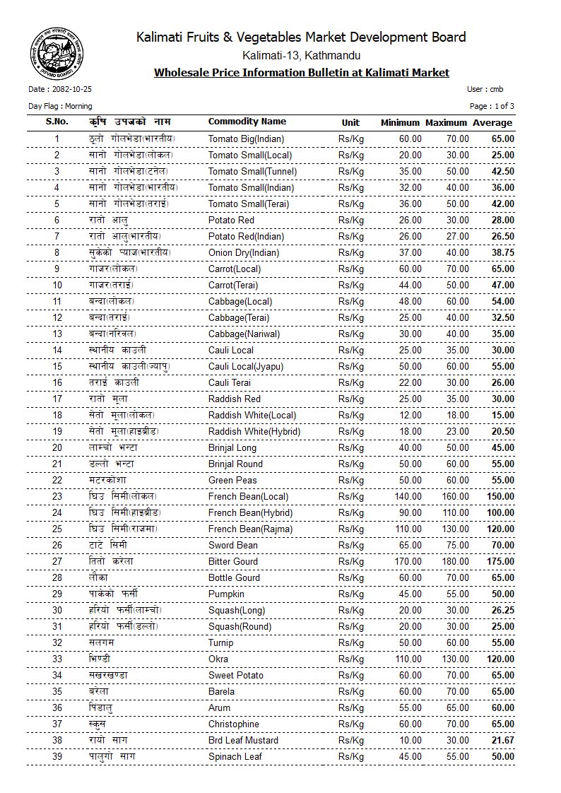 करेला १७५, लौका ६५, डल्ले फर्सी २५, पाकेको फर्सी ५०, भिन्डी १२०, कन्य च्याउ ९०, डल्ले च्याउ ३२५, सिताके च्याउ ९००, ब्रोकाउली ४८ रुपैयाँ प्रतिकिलो छ। कालिमाटीमा हिजो ठूलो भारतीय गोलभेँडा ६५, सानो लोकल गोलभेँडा २६, रातो आलु २८, भारतीय रातो आलु २६, भारतीय सुकेको प्याज ३७, लोकल बन्दा ५५, स्थानीय काउली ३७, लाम्चो भन्टा ४८, डल्ले भन्टा ५७ रुपैयाँ प्रतिकिलो थियो।