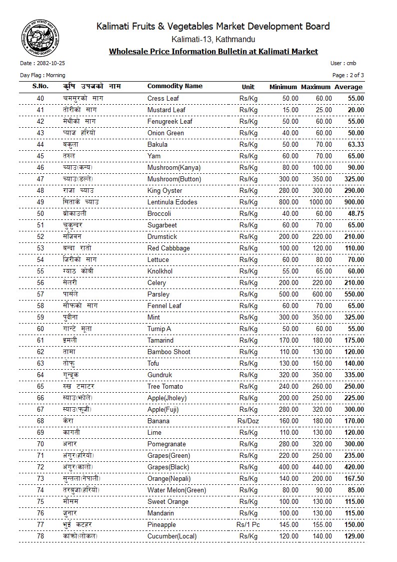 करेला २१०, लौका ६५, डल्ले फर्सी २५, पाकेको फर्सी ५०, भिन्डी ११५, कन्य च्याउ ८५, डल्ले च्याउ ३१५, सिताके च्याउ ९००, ब्रोकाउली ५१ रुपैयाँ प्रतिकिलो थियो।