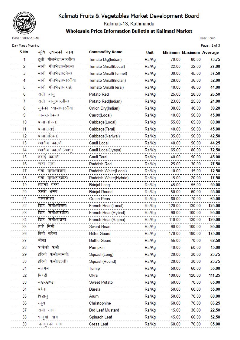 कालिमाटीमा हिजो ठूलो भारतीय गोलभेँडा ७५, सानो लोकल गोलभेँडा २७, टनेलको सानो गोलभेँडा ३७, रातो आलु २६, भारतीय रातो आलु २४, भारतीय सुकेको प्याज ४१, लोकल बन्दा ६१, स्थानीय काउली ५०, लाम्चो भन्टा ५२, डल्ले भन्टा ६२ रुपैयाँ प्रतिकिलो थियो।