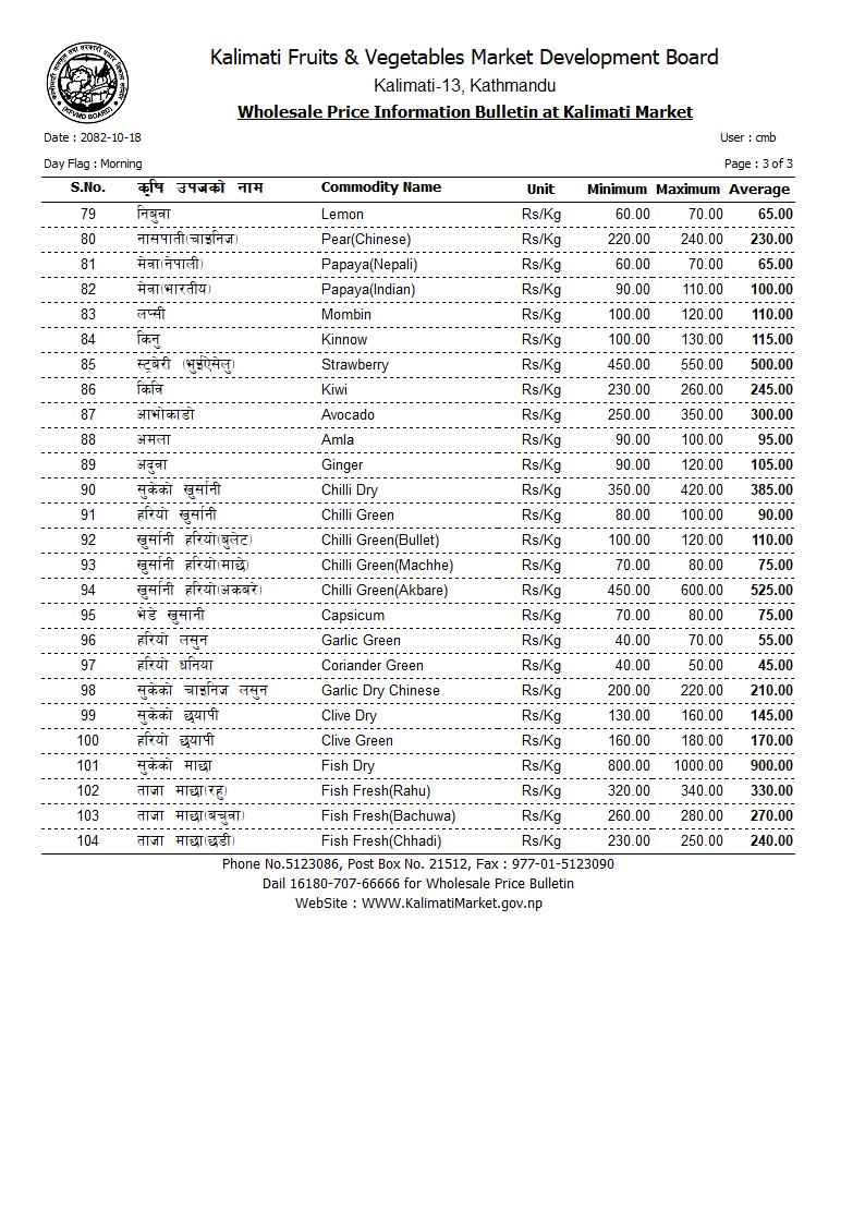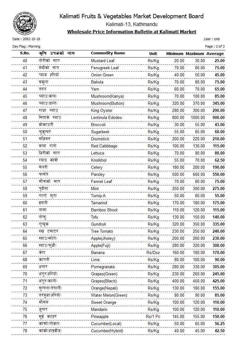 करेला १८०, लौका ७७, तराईको परबल २३०, डल्ले फर्सी ३२, पाकेको फर्सी ४५, भिन्डी १२५, कन्य च्याउ ८५, डल्ले च्याउ ३२५, सिताके च्याउ ९००, ब्रोकाउली ५० रुपैयाँ प्रतिकिलो थियो।