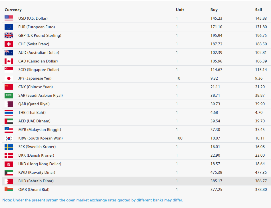 आज बहराइन दिनार १ को खरिददर ३८५ रुपैयाँ १७ पैसा र बिक्रीदर ३८६ रुपैयाँ ७७ पैसा छ। हिजो बहराइन दिनार १ को खरिददर ३८४ रुपैयाँ ८८ पैसा र बिक्रीदर ३८६ रुपैयाँ ४७ पैसा थियो।